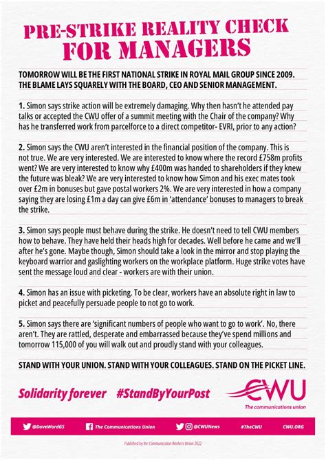 In conclusion, the Royal Mail CWU is an essential part of the Royal Mail ecosystem, and it has a profound influence on the lives of postal workers. By understanding the role and responsibilities of the CWU, we can gain a deeper appreciation for the complexities of the postal industry and the importance of advocating for workers’ rights. So, the next time you see a Royal Mail worker, remember the CWU. They’re working hard to make sure our postal service works for everyone.