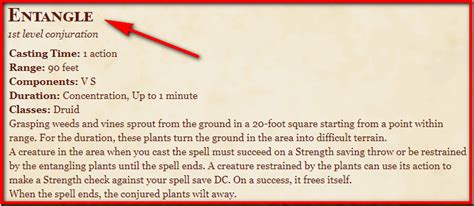 Let’s break down the nitty-gritty of the spell. Entangle is a 1st-level spell, meaning it’s accessible to you early on in the game. It requires only one action to cast, and has a range of 90 feet, so you can set it up from a safe distance. Here’s a quick rundown of its mechanics: