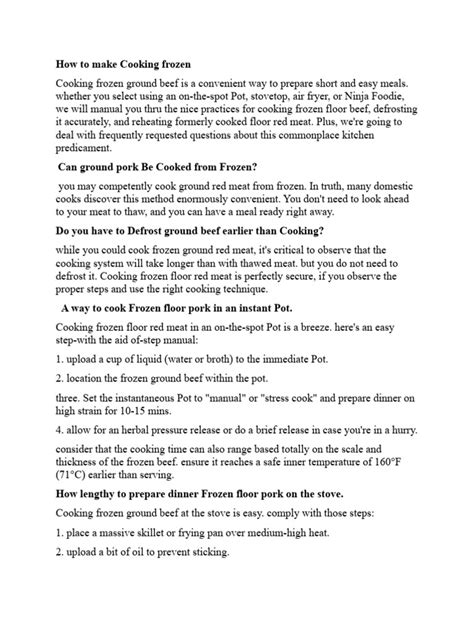 Even with the best intentions, cooking frozen foods can sometimes lead to disappointing results. But don’t worry, guys, we’re here to help you avoid those common pitfalls! One of the biggest mistakes is simply overcrowding your pan or baking sheet . When you pile frozen ingredients too high, they steam instead of sear or roast. This leads to that dreaded soggy texture and uneven cooking. Always give your frozen items space to breathe! Cook in batches if necessary, especially when stir-frying or roasting vegetables and meats. Another frequent error is not accounting for the extra moisture . Frozen foods contain ice, which melts as they cook, releasing water. If your recipe doesn’t account for this, you might end up with a watery sauce or a soggy bottom. Techniques like pre-cooking vegetables to release moisture, or ensuring good ventilation when roasting, can help. For cooking in frozen items that are meant to be crispy, like fries or breaded chicken, make sure your oven is fully preheated and consider using a wire rack over your baking sheet to allow air circulation. A third pitfall is thawing meat improperly . As we mentioned before, thawing at room temperature is a huge no-no for food safety. Stick to refrigerator thawing, cold water baths, or microwave defrosting, and always cook meat immediately after microwaving. Finally, not adjusting cooking times is a classic mistake. Frozen foods generally take longer to cook than their fresh counterparts because the heat has to work its way through the ice. Always add extra time, and more importantly, use a food thermometer to check for doneness, especially with meats. Cooking in frozen doesn’t have to be tricky, but it does require a little mindfulness about moisture, heat, and time. By avoiding these common errors, you’ll be well on your way to delicious, successful meals every time!