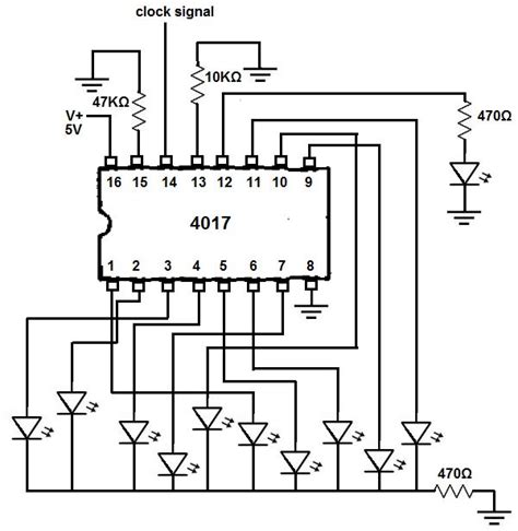 - Connect Outputs: Connect LEDs (with current-limiting resistors) to the output pins (Pins 3, 2, 4, 7, 10, 1, 5, 6, 9, 11) of the IC 4017. Make sure the LEDs are oriented correctly (anode to positive, cathode to ground).