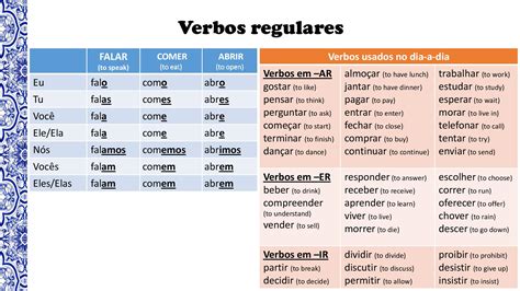 These are important for forming basic sentences. For example, “Eu falo português” (I speak Portuguese).
