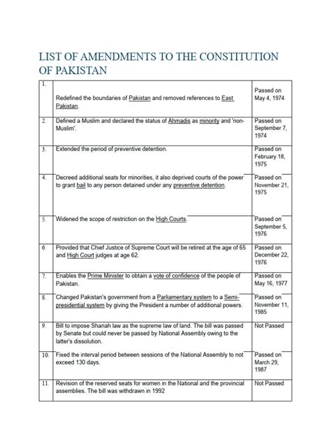 Then we have the Constitution (Eighth Amendment) Act, 1985 . This was a really pivotal amendment, introduced during a military regime. It fundamentally altered the balance of power, most notably by giving the President enhanced powers , including the ability to dissolve the National Assembly and dismiss the Prime Minister. This amendment aimed to institutionalize a role for the military establishment in political affairs and created a complex power dynamic that would be a source of contention for decades. It effectively introduced a semi-presidential system, albeit one that often operated under military influence. The Eighth Amendment became a symbol of the struggle between civilian supremacy and military intervention, with subsequent governments attempting to curtail or repeal its provisions.