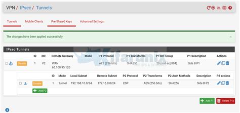 1. Navigate to VPN > IPsec > Tunnels: On both pfSense firewalls, go to VPN > IPsec > Tunnels .