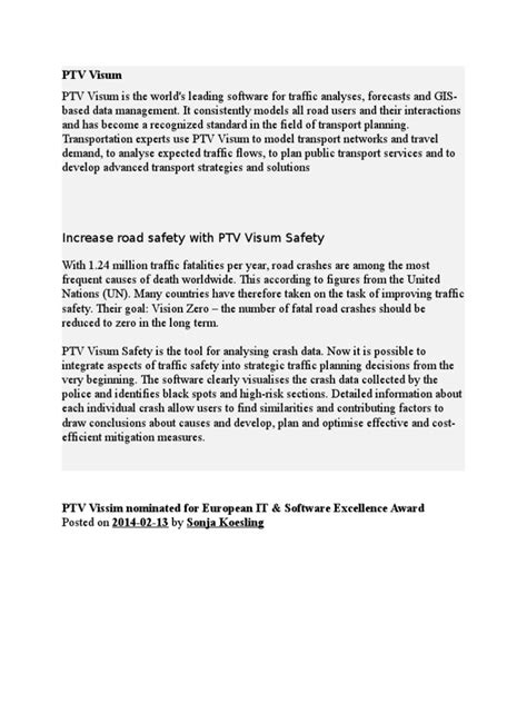 • Increased Safety: By simulating traffic flow and identifying potential safety hazards, PTV Visum can help to improve road safety. This can save lives and reduce the number of accidents. Imagine a city trying to reduce the number of accidents at a particular intersection. By using PTV Visum , planners can simulate traffic flow at the intersection and identify potential safety hazards, such as poor visibility or inadequate signage. This allows them to implement safety improvements that can reduce the risk of accidents.