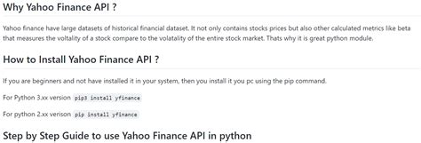 First off, why even bother with the Yahoo Finance API? There are a bunch of reasons. For starters, it’s relatively easy to use. Plus, Yahoo Finance has been around for ages, so it’s a pretty reliable source for stock prices, historical data, and other financial goodies. You can get real-time stock quotes, financial statements, and even news articles related to companies. For anyone looking to build their own investment dashboard, conduct market research, or automate trading strategies, the Yahoo Finance API is a fantastic tool. It provides programmatic access to a vast ocean of financial information, allowing you to integrate this data directly into your Python scripts and applications. This means you can automate data collection, perform complex analyses, and visualize trends without having to manually sift through websites or spreadsheets. By leveraging the power of Python and the Yahoo Finance API, you can unlock new possibilities for financial analysis and decision-making.