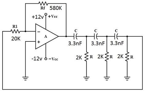 The feedback resistor (Rf) is crucial for setting the gain of the op-amp. The gain (A) of the amplifier in an RC phase shift oscillator needs to be at least 29 to ensure sustained oscillations. This is because the attenuation of the RC network is approximately 1 29 .