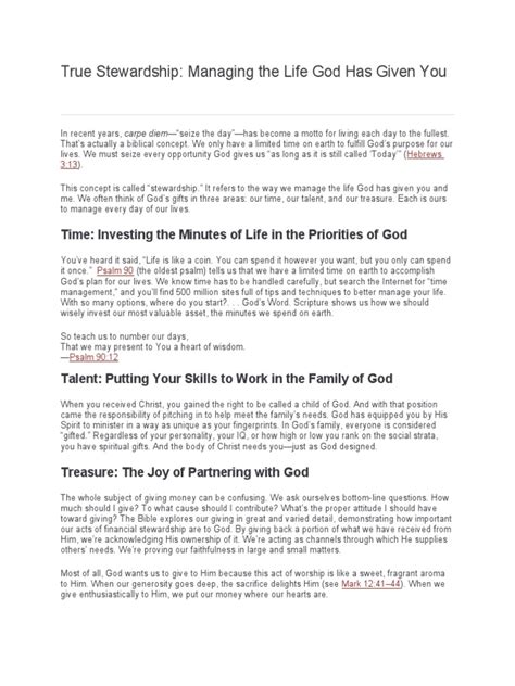 Personal stewardship is about taking care of yourself – your health, your talents, and your relationships. This involves making healthy lifestyle choices, such as eating nutritious foods, exercising regularly, and getting enough sleep. It also means developing your skills and talents, pursuing your passions, and nurturing meaningful relationships with family and friends. Personal stewardship is about recognizing your own worth and potential and investing in your own growth and well-being. This includes setting goals, pursuing education and training, and seeking out opportunities for personal and professional development. Additionally, personal stewardship involves managing your time effectively, setting boundaries, and prioritizing self-care to avoid burnout. It also means cultivating a positive mindset, practicing gratitude, and fostering resilience in the face of challenges. Ultimately, personal stewardship is about taking responsibility for your own life and creating a fulfilling and meaningful existence. It’s a journey of self-discovery, growth, and continuous improvement, empowering you to live your best life and make a positive impact on the world around you.