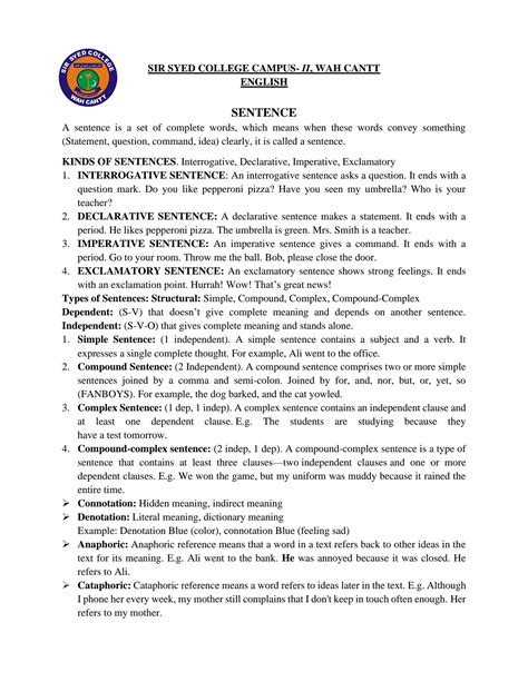 Time to talk about sentence structure . This is all about how we arrange words to form complete thoughts. Understanding sentence structure is crucial for writing clear, concise, and grammatically correct sentences. A basic sentence includes a subject (who or what is performing the action) and a verb (the action itself). Sentences can also include objects (who or what is receiving the action) and other modifiers. There are four main types of sentences, each with a different purpose. Simple sentences have one independent clause (e.g., The dog barks ). Compound sentences have two or more independent clauses joined by a conjunction (e.g., The dog barks, and the cat meows ). Complex sentences have one independent clause and one or more dependent clauses (e.g., Because the dog barks, the cat hides ). Compound-complex sentences have two or more independent clauses and one or more dependent clauses. By varying sentence structure, you can add rhythm and interest to your writing, making it more enjoyable to read. Correctly constructing sentences allows you to clearly express your ideas and engage your readers.
