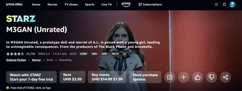 Another option is to rent or buy M3GAN on platforms like Amazon Prime Video , Google Play Movies , Apple TV , or Vudu . This is a pay-per-view method, so you’ll only pay for what you watch. Renting usually gives you a 48-hour window to watch the movie, while buying gives you unlimited access. If you’re not ready to commit to a full subscription but still want to watch M3GAN , renting or buying might be the perfect choice for you. This method gives you flexibility and ensures you only pay for the content you consume.